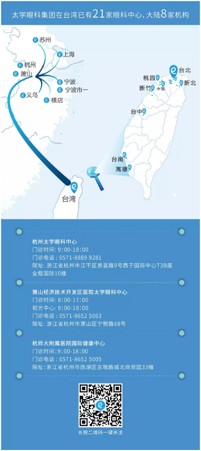 截至目前,太学眼科集团在宝岛台湾已有21个眼科中心,在大陆已于上海、杭州、萧山、苏州、宁波太学、宁波市一、义乌、横店设立了8家眼科诊疗机构,未来也将持续扩点。