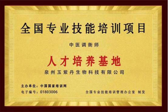 2017年12月,泉州玉紫丹生物科技有限公司向中国国家培训网递交了中医调衡师的立项申请和完整的立项资料,经中国国家培训网的专家委员会和项目管理办公室的审核与认定,同意授权玉紫丹公司负责中医调衡师项目在全国的招商、培训、推广和实施工作。