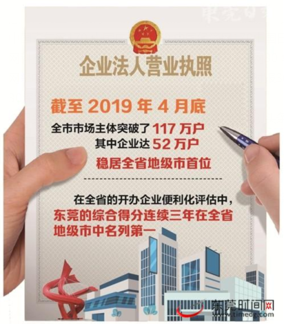 该局统计数据显示,2018年,全市新登记市场主体26.49万户,同比增长18.71%,创下了历史新高。截至2019年4月底,全市市场主体突破了117万户,其中企业达52万户,稳居全省地级市首位。在全省的开办企业便利化评估中,东莞的综合得分连续三年在全省地级市中名列第一。