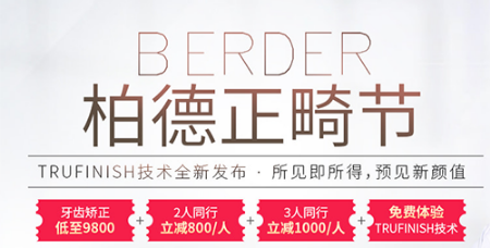 5月正畸月,柏德口腔矫牙优惠大放送!预约来院即可免费体验Trufinish技术+矫牙动画方案设计;领取数字化口腔扫描体验名额;2人同行矫牙各减800,3人同行各减1000;隐形牙套免费试戴!更多优惠详情咨询热线:400-8686-333。