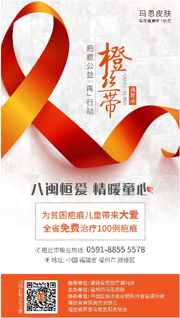 2019年5月18日,由福州玛恩皮肤疤痕救治中心主办,由福建省民政厅慈善福利处指导,集结了福建省养老与康复服务协会、福建省麻风防治协会、中华医学会福建省皮肤性病学分会等机构组织,联合举办了“八闽恒爱情暖童心”疤痕橙丝带公益项目。2019年度,玛恩计划投入300万元资金救助不低于100例疤痕患者,并集结了全国从事疤痕疾病学术研究与临床治疗的200多位知名皮肤科医师作为公益项目的指定会诊专家,旨在通过疤痕救治帮助更多的疤痕儿童,还他们圆满人生。