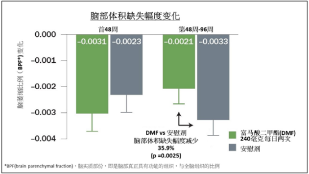 不过,待治疗进行了一段时间后,假萎缩效应便告消失,药物对脑部体积缺失幅度的影响便真正开始出现。根据研究数据,服用DMF的多发性硬化症患者于服服药第48周至96周期间,其脑部体积缺失的幅度,明显较安慰剂组病人减少接近四成(35.9%),换言之,病人長期服用DMF下,可成功減少腦部的萎縮幅度。