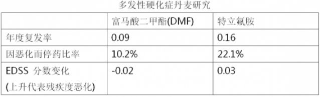 事实上,DMF对多发性硬化症的治疗效果,已先后获得其他研究证实。刚刚于4月在国际医学期刊《神经病学》(Neurology)发布了一项丹麦研究,透过检视2,236名服用一线口服药物的多发性硬化症患者的病历纪录,当中包含了767名服用DMF的,及1,469名服用特立氟胺(teriflunomide)的,来分析病人服药后的情况。结果如下: