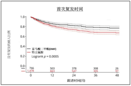 由此可见,DMF在减少复发次数及病情恶化的表现上较特立氟胺优胜,而于代表残疾程度的EDSS分数上,两者的表现分别不大。但在推迟复发的表现上,从下图所见,服用DMF而没有出现复发患者的比例,一直高于服用特立氟胺的,即是DMF较特立氟胺有效推迟复发。