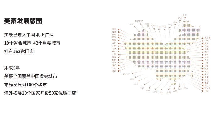 目前,美豪品牌在北上广深等19个省会城市 42个重要城市拥有172家门店,未来5年将全面覆盖中国省会城市,在国内布局发展到100个城市,在海外拓展10个国家开设50家优质门店。