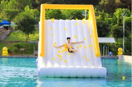 九寨水城拥有两万平方米的超大泳池,包含健将池(2.5米-3米)、标准池(约1.5米)、儿童池(约0.4米)。除了本身的优质水源外,园区还投入500万引入先进的七层过滤系统,实时线上监控水质,每天公布水质状况,水质清新洁净,没有消毒味。同时,配套了一批水上娱乐设施与网红火箭艇、双人水圈,水上飞毯充气等游水产品。