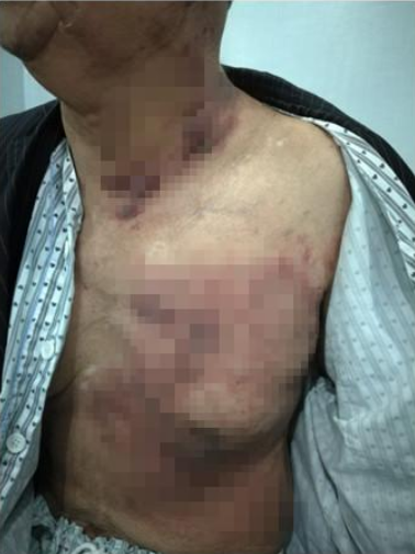 79岁的蔡叔是广东人,三个月前他的左上肢肿胀,颈部和胸部有多个肿物,有疼痛和瘙痒感。他在当地找老中医看病,被当作皮疹医治,吃了几副中药并使用了外敷药物,非但没有效果,颈部和胸部的肿物还不断增多,增大,局部出血,上肢肿胀加重。