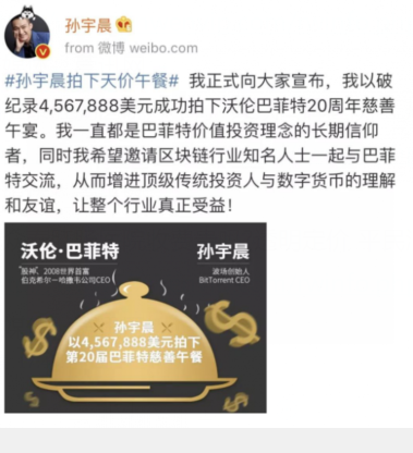 有意思的是,今年这位“史上最贵”的午餐的得主竟是币圈90后大佬波场TRON创始人孙宇晨。要知道,巴菲特曾多次在公共场合提出要“远离比特币,那只是一种幻觉”,指出比特币是赌博而并非投资,巴菲特甚至提醒投资者“比特币的毒性比老鼠药更大”。