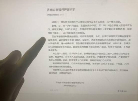 对此,济南农商行发布声明称,彭博为达到个人目的,捏造事实,对有关人员进行诽谤、恶意中伤,相关人员已报案。