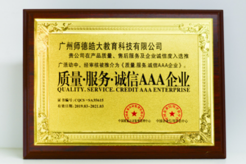 2019年,在全国范围内开展的“质量服务诚信AAA企业”评选工作中,经中国质量认证监督管理中心、中国企业信用评估中心综合多方面的严格审核,广州师德皓大教育科技有限公司更是凭借着雄厚的综合实力,斩获“质量服务诚信AAA企业”称号。广州师德皓大教育科技有限公司将继续以口碑和体验为核心点,由内之外完善自身建设,提供更多优质的学习内容,继续领跑在线教育市场。