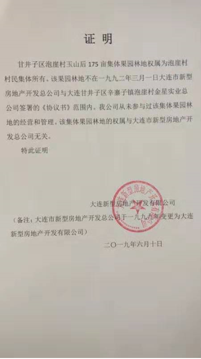 记者在返程的路上,接到了一知情人发来的由大连新型房地产开发有限公司出具的证明。证明如下,甘井子区泡崖村玉山后175亩集体果园林地权属为泡崖村村民集体所有。该果园林地不在1992年3月1日大连市新型房地产开发总公司与大连甘井子区辛寨子镇泡崖村金星实业总公司签署的《协议书》范围内。我公司从未参与过该集体果园林地的经营和管理。该集体果园林地的权属与大连市新型房地产开发总公司无关。(备注:大连市新型房地产开发总公司于1999年变更为大连新型房地产开发有限公司)