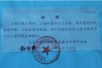 记者在反映人提供的材料中发现了一份按有大连市国土资源和房屋局甘井子分局公章的证明,证明内容如下,本图红线范围内,土地权属性质为集体,属泡崖村村民集体所有,土地类别为林地,项目用地不符合大连市城市中心区土地利用总体规划。该证明落款时间为2016年8月30日。
