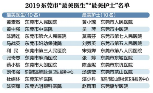 昨日下午,市卫生健康局正式发布2019东莞市“最美医生”“最美护士”评选结果的公示。公示名单上,新上榜的有10名“最美医生”和10名“最美护士”。大家快来看看有没有你认识的医护吧。