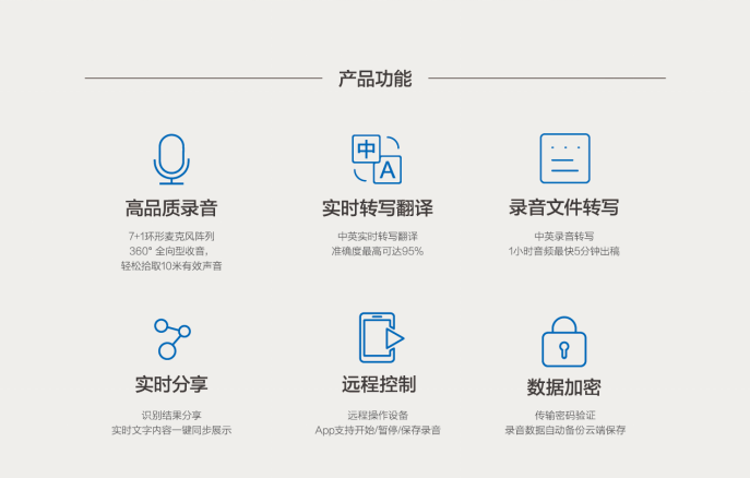 讯飞听见M1是一款以专业录音,实时语音转文字及翻译为核心功能的智能硬件。机身配置8枚环形麦克风阵列,实现全向收音;同时可一键连接讯飞听见App,实现支持远程控制设备,异地会议文字直播。充分满足会议内容多终端同步,访谈记录快速出稿,外教课程实时翻译等多场景的录音整理需求,全面提升工作效率。