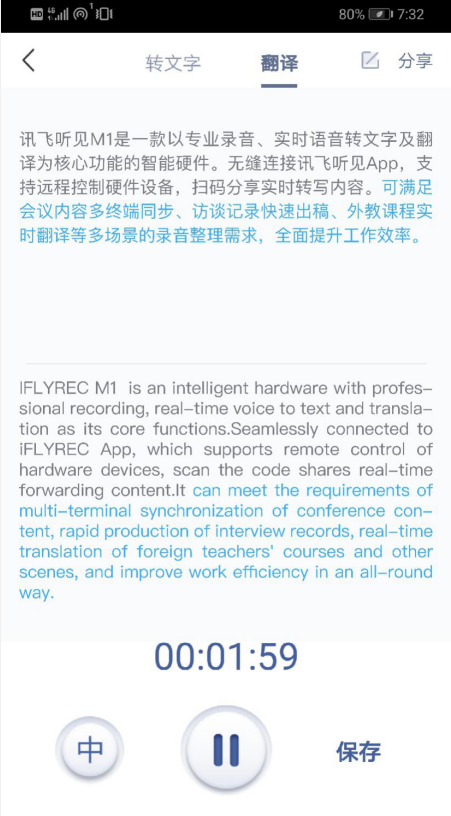讯飞录音笔-讯飞听见M1可实现中、英文实时转写和翻译,准确率高达95%。基于科大讯飞强大的语音转写能力为基础,不仅能够实现实时的语音转写文字,同时还可以实现英文翻译,结果准确率高达95%,即便是参加跨国会议也没有压力。录音结束后可快速上传音频获得文字转写结果,1小时音频5分钟左右即可出稿,高效、准确、快捷~