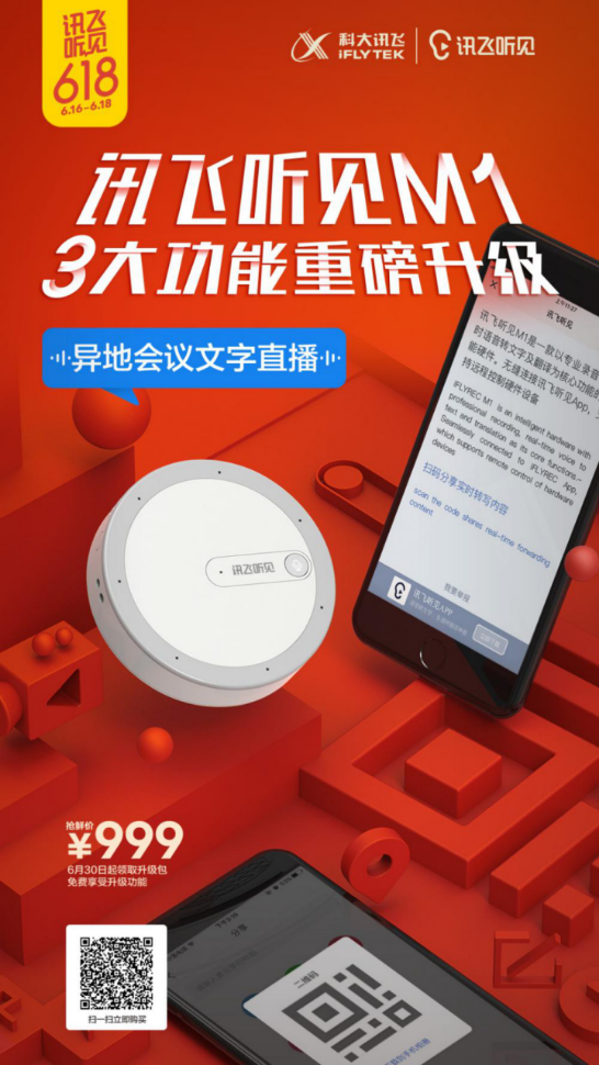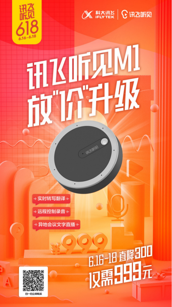 6月16日-18日,全新升级的讯飞录音笔-讯飞听见M1直降300元,仅需999元!登陆天猫、京东科大讯飞旗舰店即可参与抢购。 成功抢到M1的朋友可在6月30日免费领取软件包,进行系统升级,即可享受所有全新功能啦~