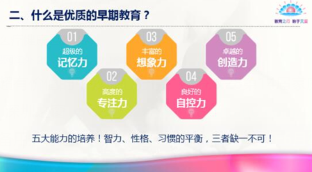 面对市场上五花八门的早教机构,家长纷纷反映不知如何挑选。一位来自北京的90后宝妈直言道:“多数早教机构的广告的确很吸引人,但送孩子过去后才发现,实际情况和宣传的完全不一致。”事实上,优质的早期教育应根据0-6岁孩子的生理、心理发展以及敏感期的特点,对孩子进行有针对性的指导和培养,为孩子智商、情商的双重发展建立良好的基础。如果能够在0-3岁接受科学的早教训练,孩子完全有机会在3岁前迎来智力大爆发,从而受益一生。
