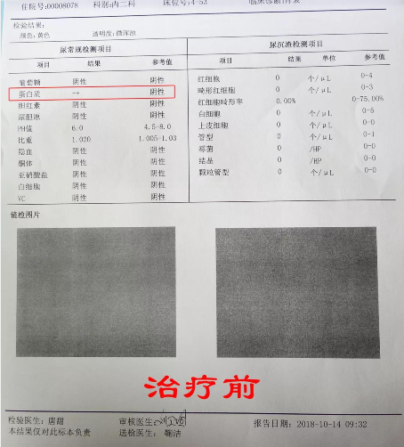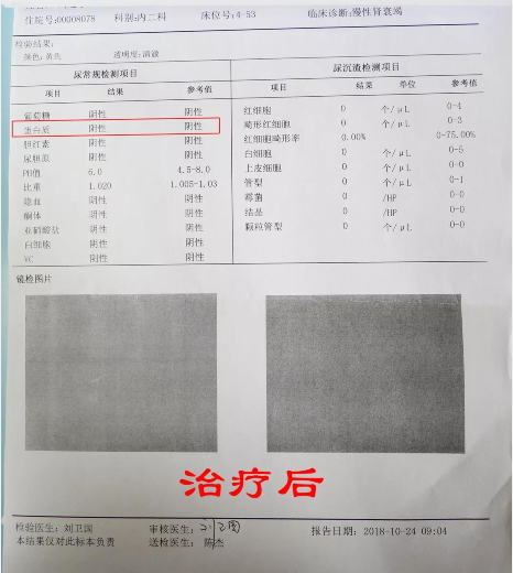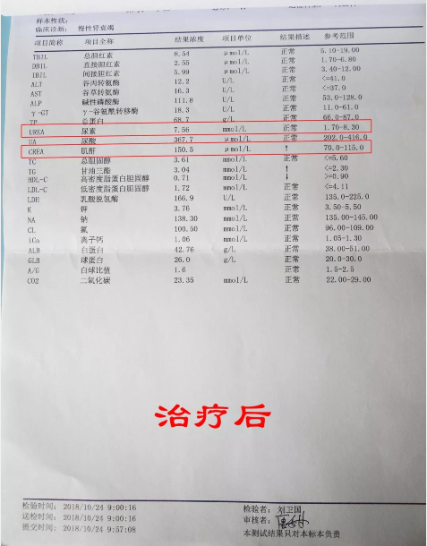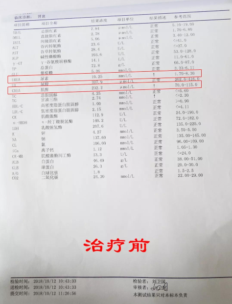 年10月迎来了难得的国庆大假,好不容易可以休息几天,我们一家人就到周边转了转,回来后我就感觉嗓子有点不舒服,腿也感觉酸胀酸胀的,我担心的复发又来了。前面我有咨询过成都一家叫中德肾病的医院,在网上也了解了下这家医院的相关信息,最开始也是抱着试一试的心态来看看。10月12号我入住到这家医院,当时大生化检查肌配232.2umol/L,尿素10. 25mo1/L,尿酸327. 9umo/L,尿蛋白2+,医生确诊我为慢性肾衰。还记的当时接诊的鞠洁院长说的一句话“你这病好好控制是完全可以跟正常人一样!”当时就给我吃了一个定心丸,前面的医生都是说这病后面就是尿毒症,把我家人吓的可不轻。
