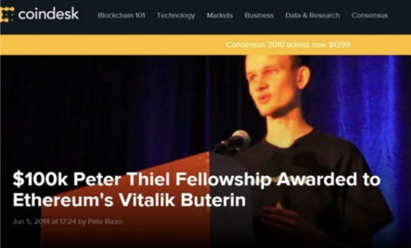 2013年年末,那时候正值中国币圈最火热的时候(没错,比2017年大牛市更火热),那时候19岁的V神刚拿了Peter Thiel的奖金(硅谷大佬,PayPal创始人给牛逼少年的奖金):