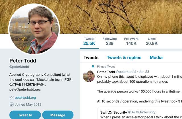 关于Peter Todd 不知道还有什么可以介绍的,没有新奇的故事没有黑历史,比特币核心开发者中的核心人物,在整个比特币世界里一直有着很大的影响力,对于比特币的发展一直贡献着自己的力量。