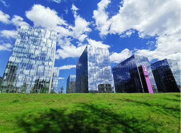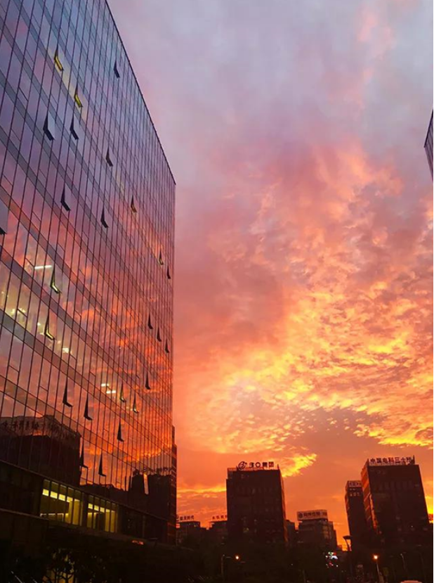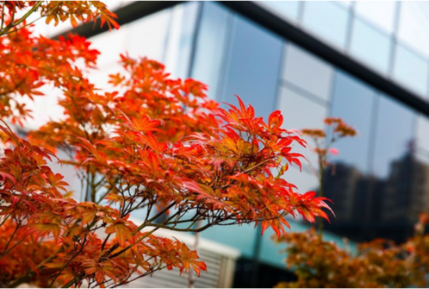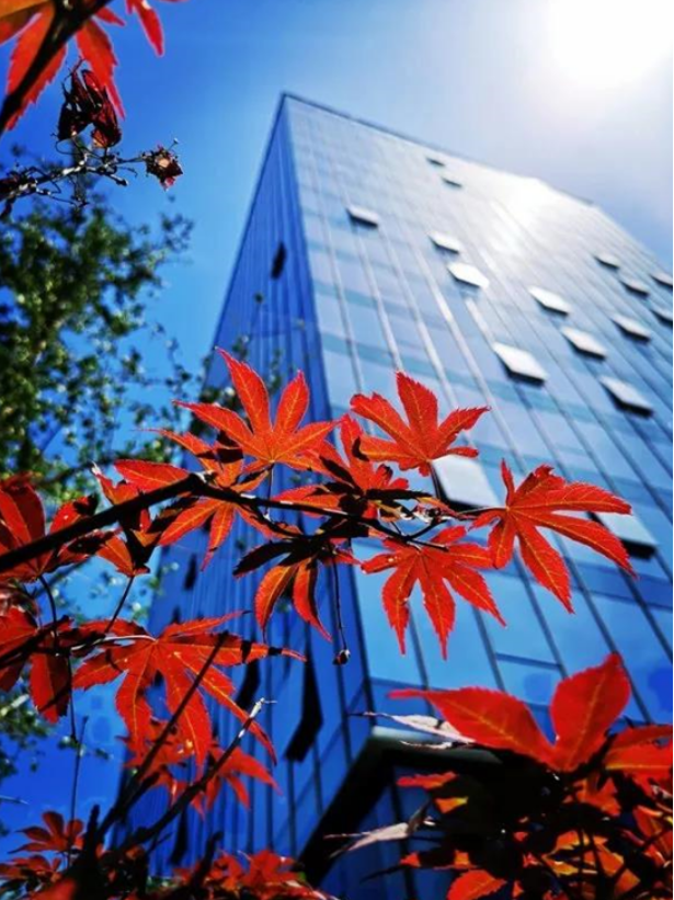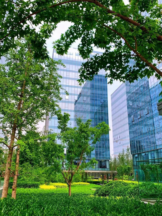 工作闲暇之余,凭窗远眺,绿色树冠随风摇曳,让疲惫的心情瞬间平复。各色花朵开得如火如荼,是美景,也像每个人的生活般美好。置身室外,拥抱自然的体验扑面而来,映在钢化玻璃幕墙上的景色像一幅加了滤镜的现代画,虚幻又时尚。更愉悦的是,呼吸着负氧含量约2000个/cm?的空气,身体的每个细胞都活跃起来。风从指尖滑过,空气中弥漫着花香,树影摇动,多彩多姿。春有桃李夏有荷,秋有菊花冬赏梅,色彩也随着季节不断变化。从春至冬,颜色或浓烈,或恬淡,构成了一副流光溢彩的景色,把森林搬进了城市。