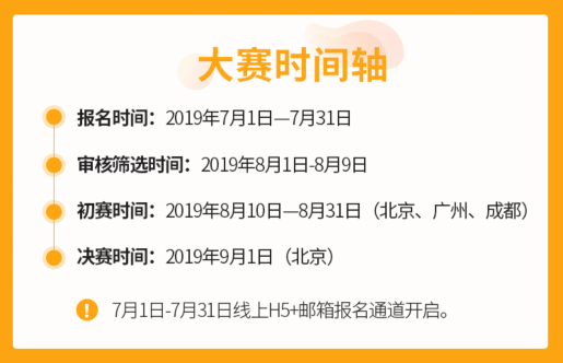 和众多报名收费不一样的是,本届大赛不收取任何费用。同时,还开通了多种报名渠道,参赛选手只要在7月1日-7月31日期间,完成报名就能获得参赛资格。