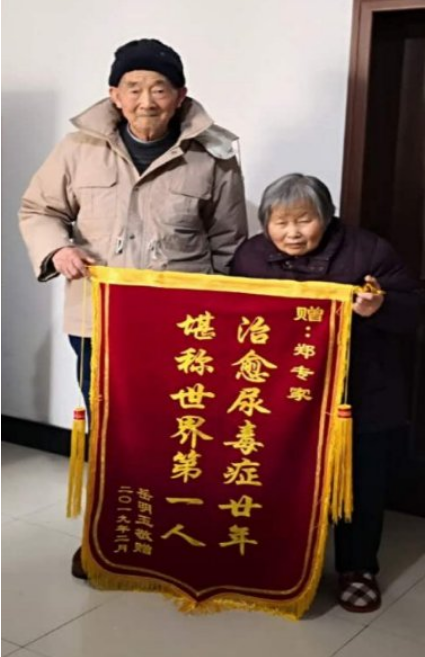 案例一:岳明玉,今年86岁了,是镇江火车站退休工人。家在江苏省镇江市丹徒新城金谷东路19号怡居苑2幢405室。治愈有21年了。当时是慢性肾功能不全多年没有治好,也到很多大医院看过,但是都没有效果,肌酐反而升到了530,所有医生的解决办法都是换肾和延迟时间等透析。但是他儿子不放弃,到处打听治疗的方法,最后打听到合肥有个郑专家能治好尿毒症,就赶紧带他找到了专家。在专家配的药治疗下,几天身体上的乏力等症状明显好转。治疗一个月肌酐就下降到了360。3个月去复查肌酐就降到了正常的79,其他检查也完全正常了。后来每半年去复查一次也都是完全正常的。