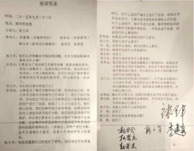 证据资料显示:2015年9月22日,在深州市法院组织了一次座谈会,主持人为张兰丰(深州法院副院长),与会人员有李建勇(本案审判长)、彭学会(本案原告)、韩文举(彭学会代理律师)、彭学庄、彭学里。在这次座谈会上,彭学会提出:主要是为了韩百杰案件执行事。因为在此之前,有几件涉及韩百杰的案件已经审结了,进行了执行程序,并对他名下的圣火公司和世纪百川宴喜楼酒店的财产进行了拍卖,拍卖了1200余万元。我们担心的是,我们的案件现在没有审结,如果法院现在对上述拍卖款项进行分配,我们的利益将得不到保护。所以我们要求对上述款项暂时不要进行处理分配,应该等所有涉及到韩百杰民间借贷和其他经济纠纷案件都审结后,一并执行,对财产进行分配。这不只是我个人意见,也是今天来的所有人的意见。张兰丰副院长的答复是:对此问题我们已经进行了研究,我们现在可以答复你们,对于上述财产确实已进行了拍卖,但现在并未实际交付。主要也是考虑到其他债权人的利益。对于上述财产,暂时不进行处理,等所有已起诉的涉及韩百杰的案件审结后,一并依法进行处理。