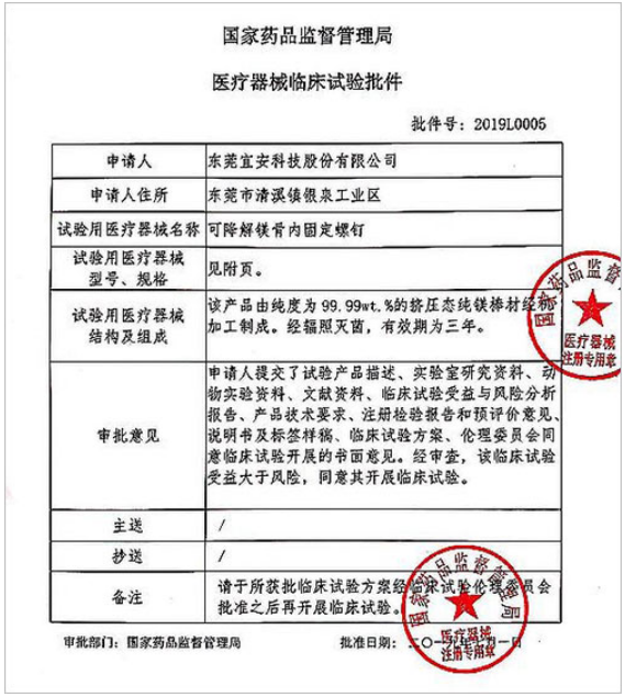 李扬德教授表示,在4月份宜安科技研发的镁骨钉已经通过欧盟医疗器械考核取得CE认证。证书的取得有助于同类产品在欧盟等海外市场投放,同时并开展美国FDA注册申请,促进公司海外业务的发展。7月12日可降解镁骨钉在取得临床试验批件后,宜安科技将开展临床试验工作,临床试验成功后申请产品注册,预计在2020年后可实现上市销售。(陈思云、小妖)