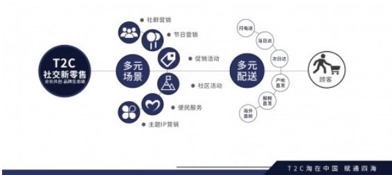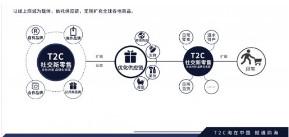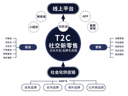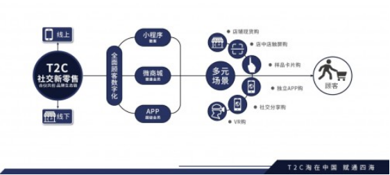 T2C运用创新型C2M定制化服务。提供强大的社会化供应链(自由品牌,合作品牌,海外品牌,公共商品库);运营(APP+小程序,活动引流等)、服务(售后服务)、培训(个人IP打造,自媒体,团队落地打造,商学院服务、丰富的素材库)、智能云仓(仓储配送)、商业赋能(品牌打造)。