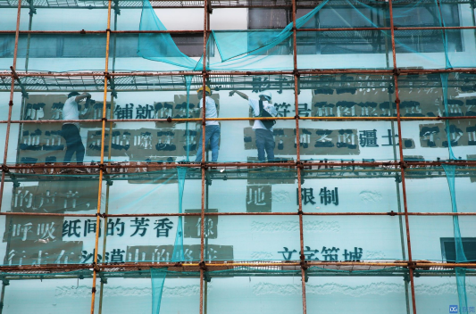 实际上,这栋房子非常有个性,外观整体是白色的,一面由文字装饰,比如“呼吸纸间的芬芳,像行走在沙漠中的骆驼”之类,是一些现实简短文艺范的句子。