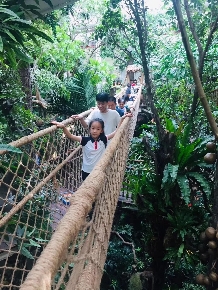 (在家长陪同下,小朋友勇敢穿越空中吊桥)