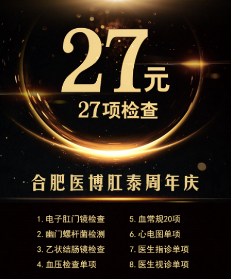 值此医院成立周年庆典来临之际,为答谢广大市民朋友多年来对合肥医博肛泰肛肠医院的大力支持,合肥医博肛泰肛肠医院特推出27元27项乐享健康检查套餐: