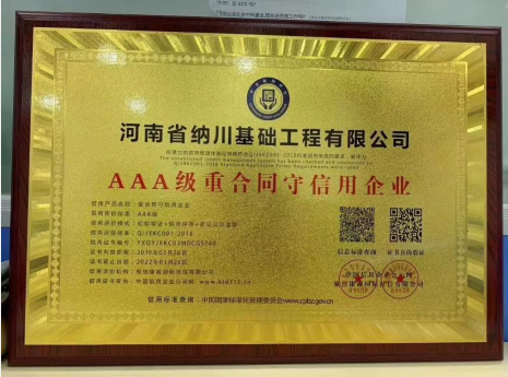 纳川公司以多年来一贯坚持的“急用户所急、想用户所想,用户第一,信誉第一、服务第一”的经营思想,获得了国家主管部门及权威认证机构的一致认可,通过了《AAA级重合同守信用企业》认证。河南省纳川基础工程有限公司以重信诚笃为合作共赢的前提,协同各地分公司,为实现国内基础工程行业的良性可持续发展砥砺前行!