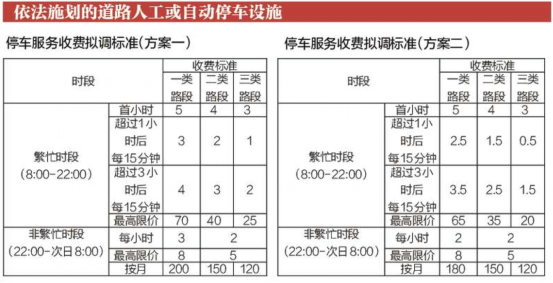 其中依法施划的道路人工或自动停车设施计费方式有较大改变,不仅分路段,还分时段。一类路段首小时5元,每日忙时最高限价70元。