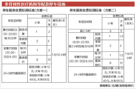非营利性医疗机构配套停车设施停车服务收费拟调标准设置了两套方案。都按照服务对象、非服务对象和闲时、忙时以及大车、小车区别计费。方案一和方案二中服务对象24小时最高限价小车都为12元、大车18元;非服务对象分别为小车48元、大车68元;小车40元、大车60元。