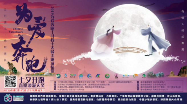 2019年8月7日是农历七月初七,也是中国的情人节——七夕节。中国爱情主题景区联盟“2019为爱奔跑——寻找十大最美旅游情侣”主题活动,即将于8月7日甜蜜启动,鼓励大家勇敢表达心中爱意的同时,更用“三行情书”的形式,让更多人感受到初心的美好与浪漫。