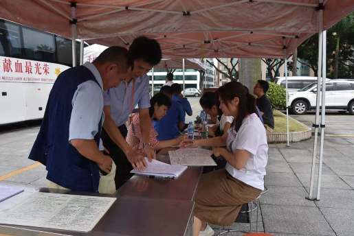 上午9点左右,东莞市中心血站的爱心献血车就已停靠在厚街政府大院广场内,不少公职人员在东莞市中心血站工作人员的指引下,填写《捐血登记表》、进行体格检查、血液初筛,有序排队,耐心等待献血。