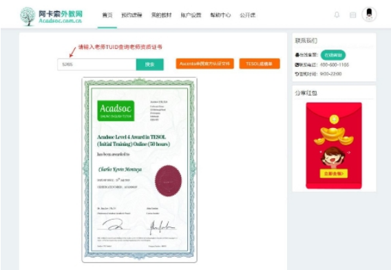 据了解,这是自7月15日教育部等六部门发布《关于规范校外线上培训的实施意见》(简称《意见》)以来,阿卡索是率先对外正式宣称落实“外教教学资质公开”政策、并主动公示外教资质的在线英语教育机构。阿卡索方表示,在线教育新政发布之后,阿卡索迅速反应,并在第一时间传达并执行新政要求,积极推进外教资质公示。不到一个月的时间,阿卡索便完成全部1万多名外教教学资质查询系统的上线工作,这得益于阿卡索在六月底就率先完成所有外教的TESOL教学资格认证。