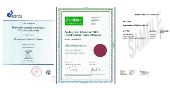 目前,阿卡索所公示的证书及相关信息正在逐步完善中,作为首家完成外教资质公示的教育机构,这一举措将会极大地促进教育行业对外教的监督和管理,增强消费者对于外教教学质量的信心。阿卡索相关负责人表示,师资力量的把控和管理是阿卡索一贯坚持的核心工作,全部外教完成TESOL认证并上线公示,就是要让消费者对我们的外教认可并放心。