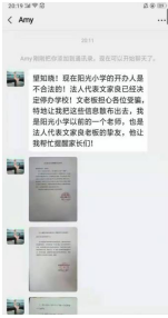 据老师反映:“2019年8月13日晚间,文家良在老师群内突然发文,要老师停止招生,另谋高就。而朱文城则让淡水园林小学的教师冒充阳光教师联系阳光小学各班学生家长,散布谣言说阳光小学已经倒闭,要他小孩赶紧去淡水园林上学,视法律为无物。淡水园林小学学校现有生源1200多学生,还要挖走阳光小学的学生。这么多的学生,而淡水园林小学只批准开班十二个班,朱文城打算怎么安排这些学生在那上课?