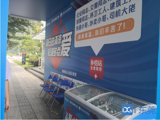8月20日,松山湖总工会再次发起“夏日送清凉, 松湖多点爱”活动,联合爱心商家及企业向园区高温工作者免费派发消暑饮料。今天记者在万科生活广场嘉荣超市前面的一个爱心驿站点看到,今年的夏日送清凉活动,招牌更亮眼,上面很大的字体写着“公安同志、交警同志、消防同志、巡警同志、环卫工人、建筑工人、快递小哥、外卖小哥、司机大佬,酷暑高温,你们辛苦了!”除了可以免费取水外,爱心驿站还摆放了一些椅子,累了可以在这里稍事休息。