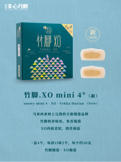 这两款榴莲被雪白的冰皮包裹着,巧妙搭配,成为了今年香港美心月饼(Hong Kong MX Mooncakes)的新品,竹脚•XO mini4(迷你榴莲冰皮月饼),竹脚榴莲奶香味浓,果香饱满;XO榴莲肉质柔软,酒香满溢。将这两个品种的榴莲制成冰皮月饼,就可一次性品尝不同的口感,相信很多人,都希望将此份美味与亲朋好友一同分享吧。