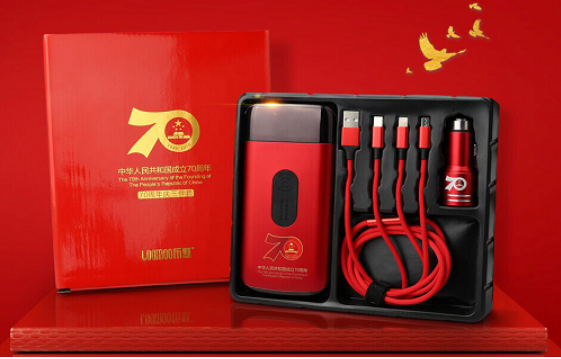 移动电源三件套,内含充电宝、三合一的充电新和通用合金迷你车载充电器。整体采用大红色设计,丝印有新中国成立70周年的logo精美图案,充电时刻我们拒绝等待,关键时刻为手机充电加油助威。