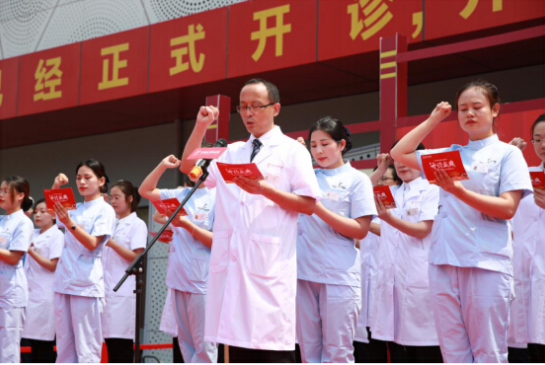 紧接着五洲医护团队在台上进行了庄严的宣誓,展示了捍卫人民群众健康的决心,也体现了五洲中医院提供高质量诊疗服务的信念。