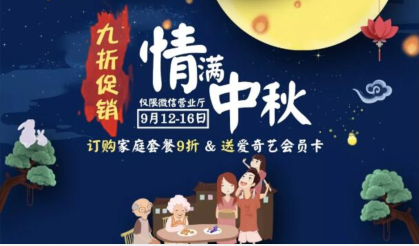 针对网络电视的种种痛点,深圳天威视讯特推出中秋特惠,在9月12日至9月16日期间订购指定电视+宽带套餐可享9折优惠,同时还可免费升级200M宽带,还有机会获赠爱奇艺专区体验卡,看电视、玩手机、下载互不干扰,享受畅快新体验。
