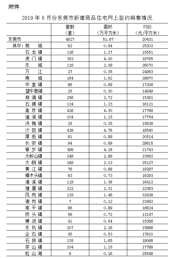 市统计局发布的数据显示,2019年8月,东莞全市新建商品住宅网上签约销售4627套,销售面积51.67万平方米。在8月全市新建商品住宅网上签约销售中,销售套数排前5位的镇街依次是沙田、高埗、寮步、虎门、麻涌;销售面积排前5位的镇街依次是沙田、高埗、寮步、虎门、大岭山。