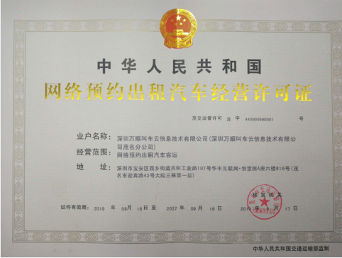 2019年9月17日,广东省茂名市交通运输管理局正式向万顺叫车颁发了《网络预约出租汽车经营许可证》,截至目前,万顺叫车在全国已获得219张网约车合法运营牌照。