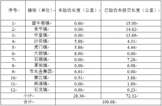 此外,东城、南城、道滘、桥头、大朗、塘厦和黄江等7个镇街自行垫资建设管网项目共约189公里,原计划9月底前应完成验收移交工作。目前南城已全部完成验收移交通水任务,其余镇街仍有约105公里未完成验收移交,进度滞后,需要进一步加快推进。