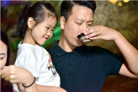 据孩子的父亲介绍,他姓黄,家在广州,几年前他就知道了连州地下河洞藏酒,今年春节有朋友送他几瓶,喝过后感觉非常不错,就萌发了给2个女儿订女儿红的想法。按照广东人的传统习俗,女儿出嫁时娘家都要送嫁妆。古时候,一些大户人家当女儿出生时还特地酿酒,装入酒埕,埋在灶口地坑,称“女儿红”,待出嫁日,让亲友分享。他就想为2个女儿提前准备1000斤女儿酒,所以特定选在连州地下河洞藏酒开坛这一天,与妻子、父母一起来给孩子订酒。